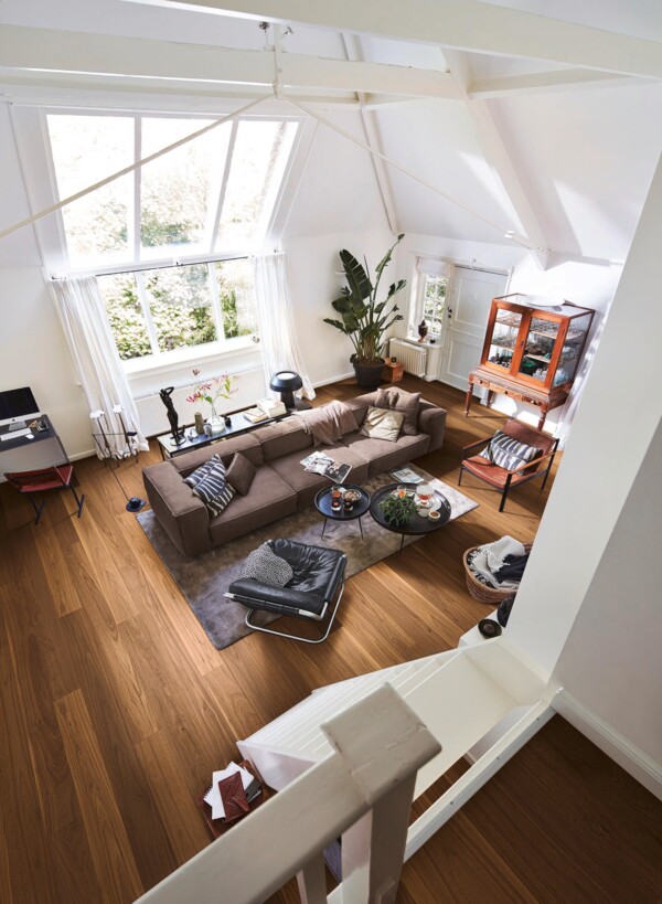 El acabado con barnizado ultramate impregna en profundidad cada poro de la madera, realzando el aspecto extranoble y natural del nogal americano. Este tratamiento convierte al suelo en una superficie muy fácil de cuidar, resistente a las manchas y especialmente insensible a los microarañazos, manteniendo su belleza incluso con el uso diario.