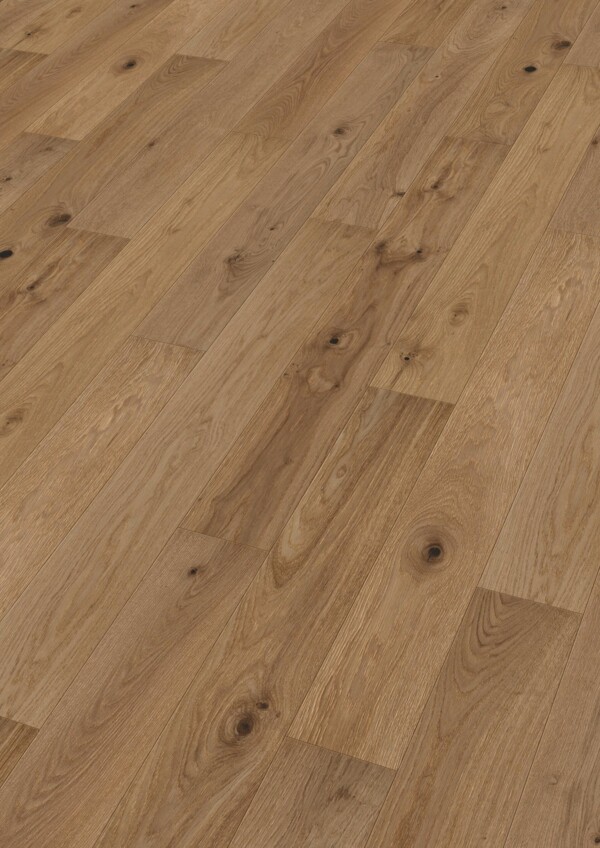 El acabado con barnizado ultramate impregna en profundidad cada poro de la madera, resaltando su aspecto extranoble y natural. Además, convierte el suelo en una superficie muy fácil de cuidar, resistente a las manchas y especialmente insensible a los microarañazos, manteniendo su estética intacta con el uso diario.