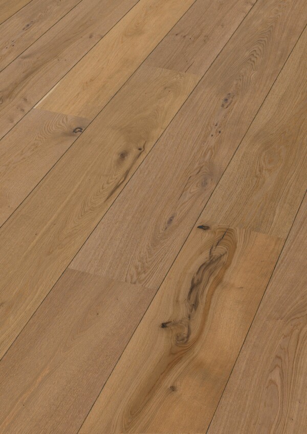 Este acabado hace que el suelo sea insensible a las manchas, resistente a los microarañazos y muy fácil de cuidar, conservando su belleza con el paso del tiempo. El cepillado realza la textura natural del roble, mientras que el bisel en V longitudinal y el microbisel en los lados cortos aportan definición y profundidad a cada tablón.