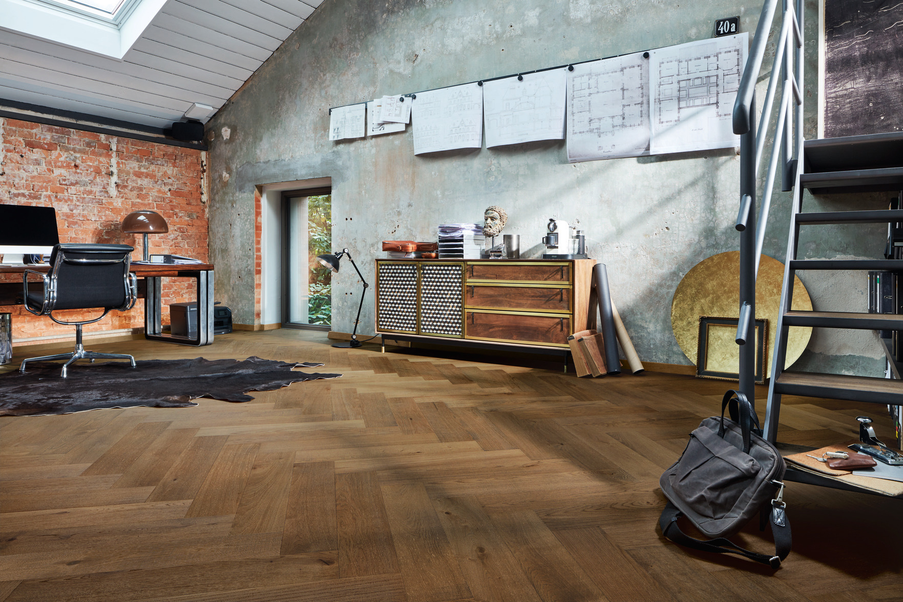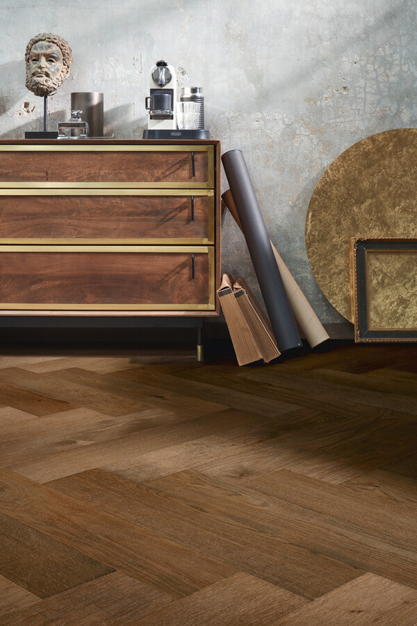 Un suelo de alta gama que combina la elegancia clásica de la espiga con un tono gris oliva actual, ofreciendo resistencia, facilidad de mantenimiento y un diseño con mucha personalidad para espacios que quieren destacar.
