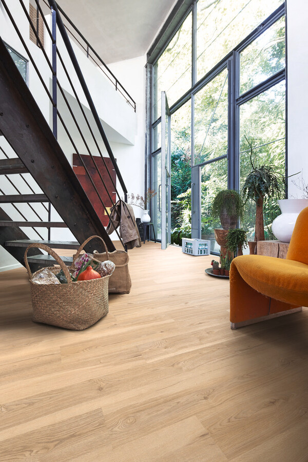 La decoración Roble puro marcante destaca por su tono marrón claro y una estructura de madera cruda con poro visible, que aporta profundidad y realismo a cada tablón. El resultado es un suelo con presencia, capaz de aportar calidez y personalidad a salones, dormitorios, pasillos o zonas de uso frecuente, encajando bien tanto en interiores clásicos como en ambientes contemporáneos de inspiración natural.