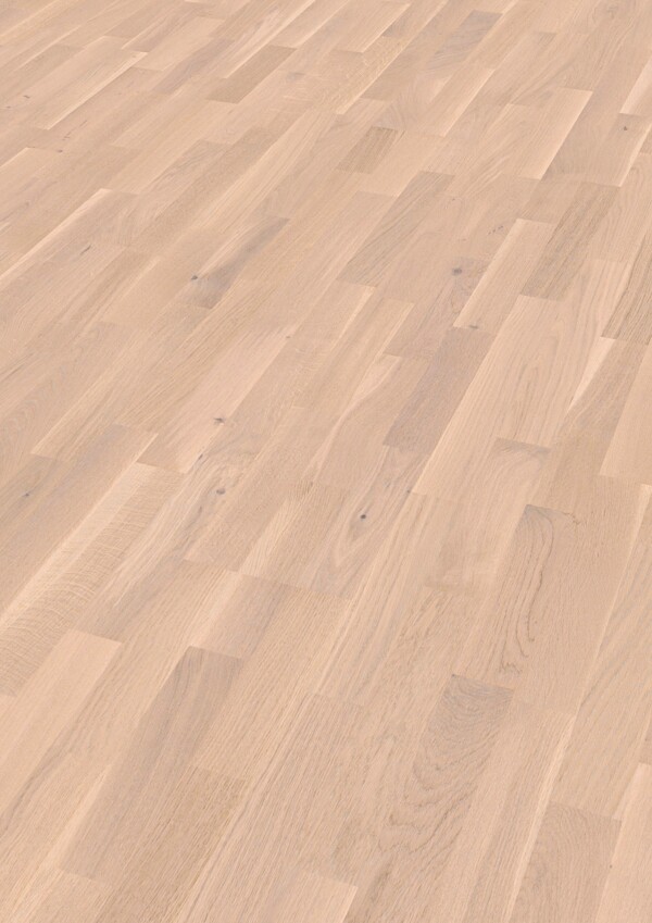 El suelo de madera MeisterParquet. longlife PC 200 – Roble vivo blanco crema es una opción luminosa y expresiva, basada en el clásico patrón de colocación a la inglesa. Este diseño combina fragmentos de madera que crean una superficie variada y con carácter, manteniendo al mismo tiempo una composición armónica, adecuada para estancias de cualquier tamaño.