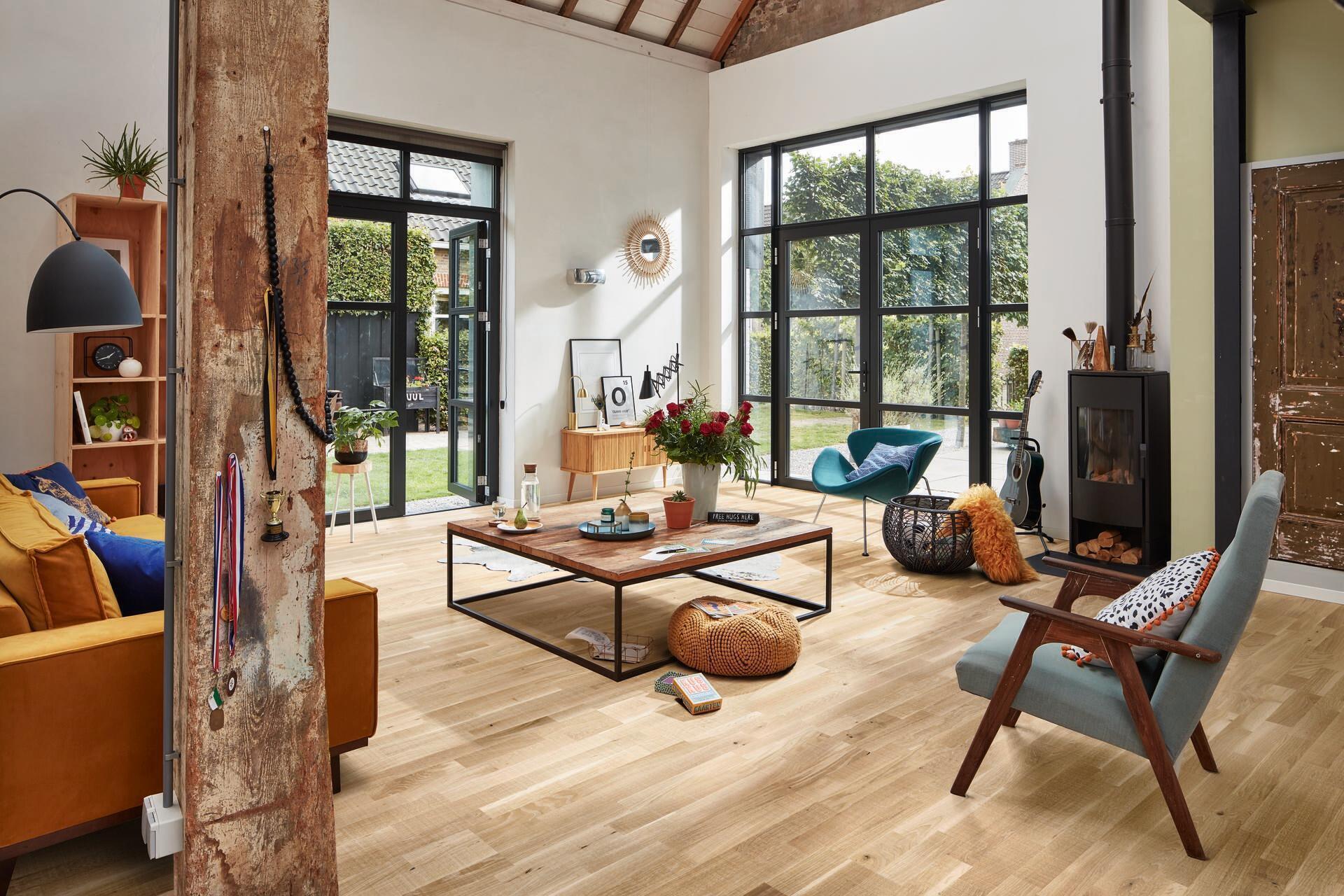Los tablones se insertan unos en otros sin juntas visibles, dando como resultado una superficie continua y muy homogénea. El acabado con barnizado ultramate impregna en profundidad cada poro de la madera, realzando su aspecto extranoble y natural. Además, convierte el suelo en una superficie fácil de cuidar, resistente a las manchas y especialmente insensible a los microarañazos, manteniendo su estética cuidada con el uso diario.