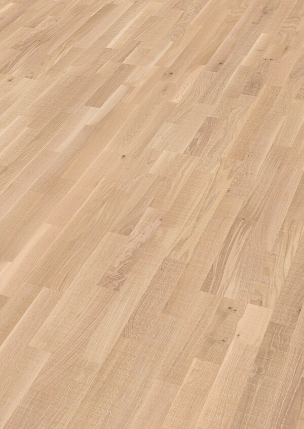 El suelo de madera MeisterParquet. longlife PC 200 – Roble vivo blanco es una propuesta luminosa y con fuerte personalidad, ideal para interiores que buscan amplitud visual sin renunciar al carácter natural de la madera. Su diseño se basa en el clásico patrón de colocación a la inglesa, que combina fragmentos de madera para crear una superficie variada y dinámica, manteniendo al mismo tiempo una composición equilibrada y armónica, adecuada para estancias de cualquier tamaño.