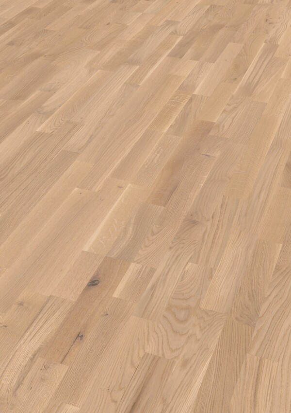 La clasificación vivo potencia la expresividad natural del roble, mostrando variaciones de veta y tono que aportan autenticidad y dinamismo al pavimento. La estructura cepillada refuerza el tacto natural de la madera, mientras que su tonalidad clara con matiz crema y base marrón claro aporta calidez suave, luminosidad y una sensación acogedora en el espacio. Puede instalarse de forma flotante o encolado en toda la superficie gracias al sistema Masterclic Plus, que garantiza una colocación rápida, precisa y segura mediante sistema de plegado.